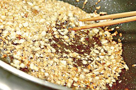 B爆香蒜茸,加蒜茸辣椒醬起鑊,加入煎香的蝦兜勻。