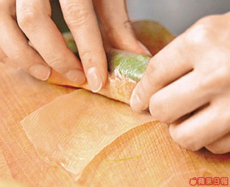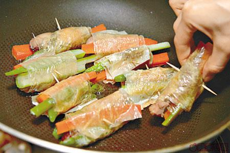 2.冬菇浸水切粗條,紅蘿蔔及蘆笋切條,一同烚熟,與雞髀肉同放腐皮上捲起,以牙籤穿好,下油鑊煎香。