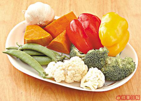 1.蜜糖豆切去頭尾及兩邊的衣,將西蘭花、椰菜花、紅椒、黃椒、南瓜切細件,下滾水灼熟,撈起備用。