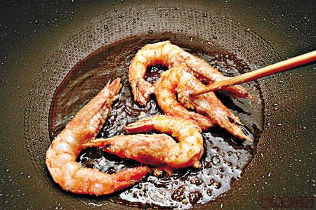 1.蝦洗淨去殼,留蝦頭及尾部剔腸。撲上生粉,煎成金黃色。