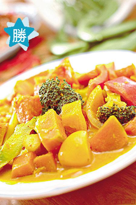 B灼熟雜菜以碟盛載,將現成咖喱醬煮熱,淋上雜菜上。