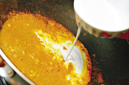 2.A蒜頭和乾葱剁成茸,下油起鑊炒香,加入咖喱粉和8湯匙水煮滾,加椰汁攪勻,放入蔬菜兜勻。