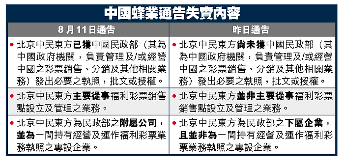 昨日的通告亦推翻中民東方從事彩票業務的陳述,並指出,按北京市工商行政管理局在03年12月12日向北京中民東方發出的營業執照,該公司主要業務範圍包括銷售金屬、木材和礦產品、建材等,提供房地產信息顧問服務,開發科學及科技產品,提供家居布置及殯儀服務,當中並無與彩票有關的業務。