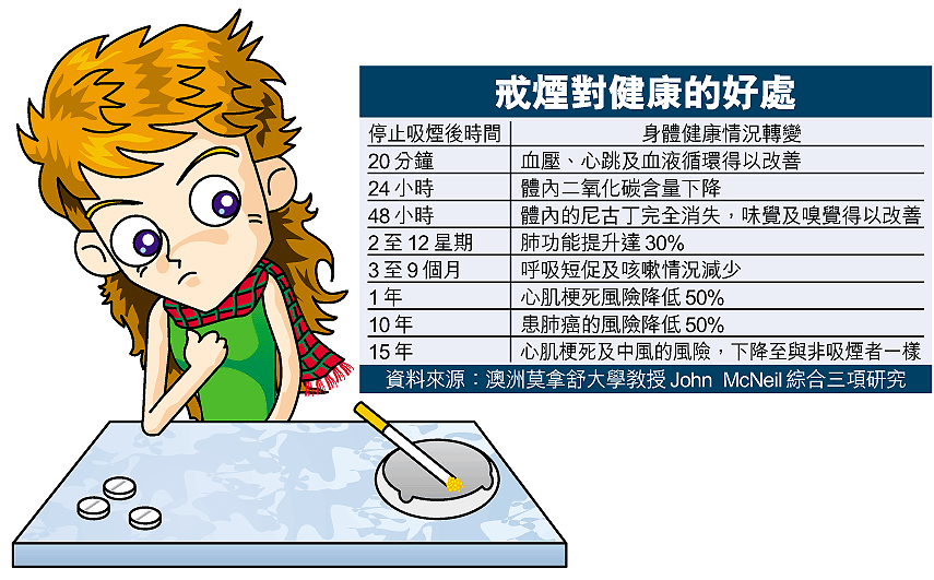 澳洲莫拿舒大學流行病學及預防醫學部主管JohnMcNeil教授引述三項研究稱,戒煙後只要二十分鐘,健康水平即可提升,十五年後心肌梗死及中風的風險更與非吸煙者無異。