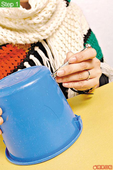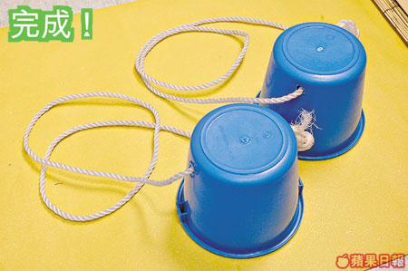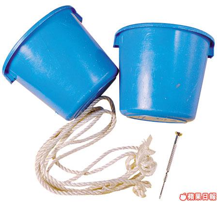 小膠桶一對、粗棉繩或其他粗麻繩、手鑽