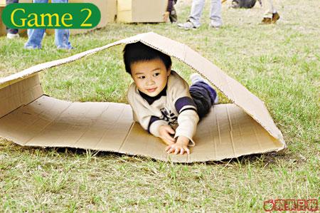 玩法:用大紙皮捲成一大圈,讓小朋友在草地上滾動。