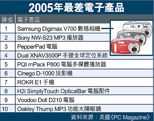 《PCMagazine》每年都對市面電子產品進行測試,並公布最差劣產品名單,當中部份在本港有售,排首位的是SamsungDigimaxV700數碼相機,雜誌批評這型號相機反應緩慢及自動曝光差勁,比不上幾個日本名牌產品;而排第二位的SonyNW-S23MP3播放器,則軟件多毛病,顯示屏設計差。