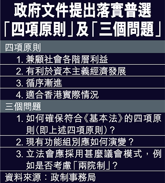 文件說,要有普選路線圖,策發會要先就三個問題達結論,就是日後政制發展模式,如何符合上述四項原則、一旦實行普選,現時功能組別如何演變、以及日後立會應採用「單院制」還是「兩院制」。