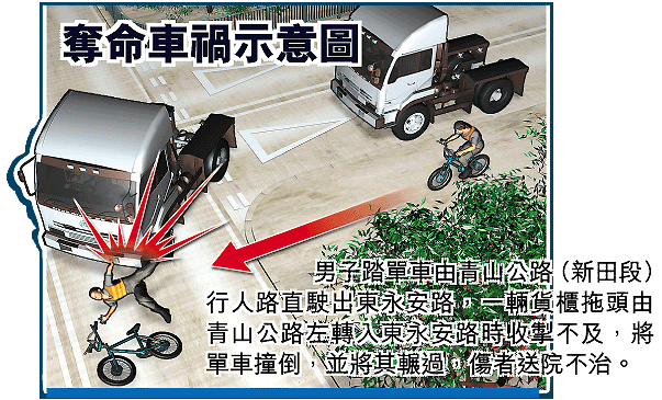 【本報訊】一名好丈夫禍不單行,妻子患上乳癌,剛做完切除手術出院休養,事主連日奔波勞累,昨日帶病返回地盤開工,其間致電回家慰問妻子,豈料竟是與妻子的最後通話。事主其後踏單車外出替公司購買電芯,懷疑因病及曾服藥以致精神不振,未有看清楚路面情況便踏單車出馬路,當場被一輛貨櫃拖頭撞倒輾過,經送院急救終告不治,留下妻子及一名在學兒子,境況堪憐。 記者:周鴻熙、梁維建