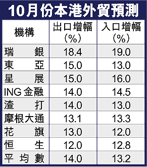 路透社向8家金融機構進行調查,當中以瑞銀對本港外貿最為樂觀,估計10月份出口和進口分別增長18.4%和19%。