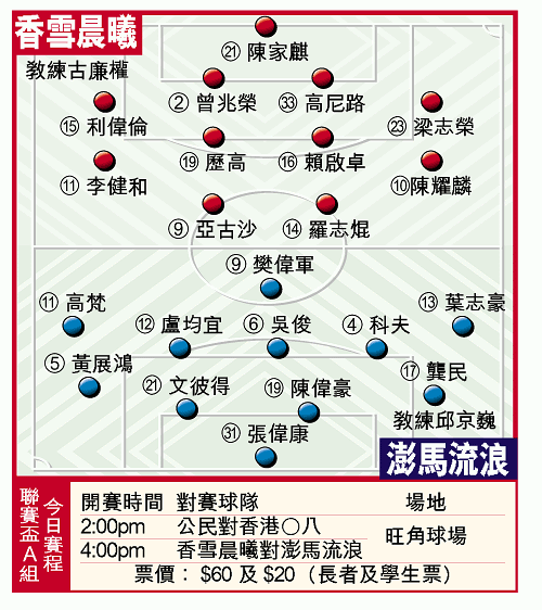 【本報訊】澎馬流浪今午四時在旺角球場上演的甲組聯賽盃A組最後一場分組賽,圖挫殘陣衞冕的香雪晨曦,以確保四強席位;而公民頭場則必須擊敗香港○八,以保出線希望。