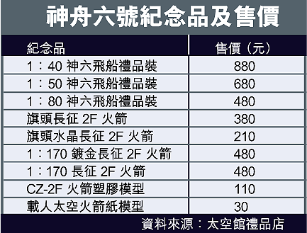 該店負責人甘盈盈指出,十月間神六升空時已向內地生產商訂購神六紀念品,由於神六產品在內地掀起搶購潮,所以香港所獲供應量有限,是次應市的神六擺設只得二十多件,相信很快即售罄。她估計神六產品較受外國人歡迎,「外國買唔到,佢哋一買就會買幾支。」相對最受港人歡迎的是售價一百一十元的塑膠火箭模型,「價錢比較平,父母會買畀小朋友。」