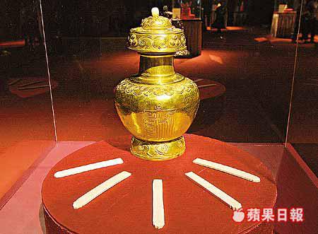 場內尚有首次展出的「八瓣蓮花大威德金剛鎏金銅像」,是六百年前明朝永樂年間製作,手工極精湛;還有清朝乾隆及以後,確認藏傳佛教格魯派活佛轉世制度的聖器「金賁巴瓶」,也在展出之列。