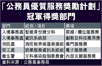 【記者謝明明報道】為推廣以客為本的服務文化,公務員事務局舉辦「公務員優質服務獎勵計劃」,其中入境處的智能身份證分科及資訊系統分別奪得兩個組別的冠軍,而消防處新界南救援組兩年前拯救屯門巴士跌落汀九橋致命車禍表現出色,奪得另一組別冠軍。得獎者均表示,他們是以市民用家角度提供服務,並會不時作出檢討,與時並進。