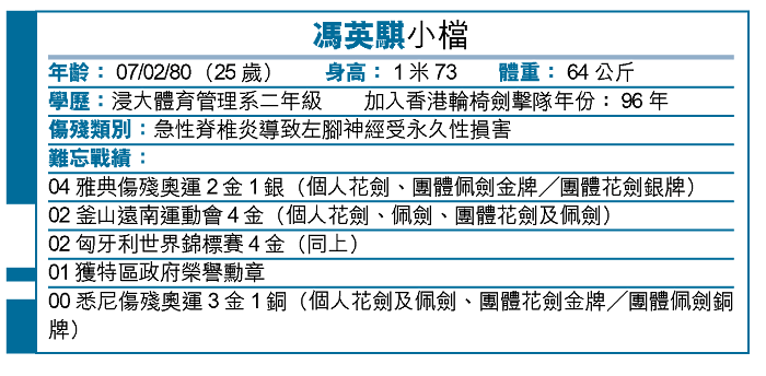 這位過去九年在輪椅劍擊上,成績好到獲特區政府頒發榮譽勳章(見附表)的劍手說:「玩皮划艇,特別是這種C艇的主因,是不想見到這個運動式微;除了輪椅劍擊,我也想參加其他運動的比賽,但要趕○八北京奧運就無可能,可能再下一屆奧運,這個運動可以玩到三十幾、四十歲。當然,奧運前若有機會,我也想試試皮划艇的亞洲錦標賽甚至是亞運會。」