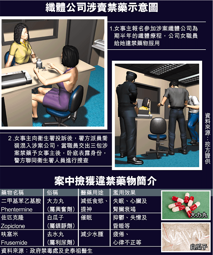 【本報訊】一名愛美女士,為追求更完美身段,不惜花費數萬元參加為期半年的纖體公司療程,卻發現公司提供違禁藥物服用,她向衞生署投訴後,署方派員喬裝其友人混入內,搜出受管制的鎮靜劑及興奮劑,公司代表昨承認藏有違禁藥品及非法販毒共五項控罪,裁判官指案情嚴重,有關禁藥可造成心臟問題致命,重判公司罰款十五萬五千元。 記者:陳美琪 戴國輝