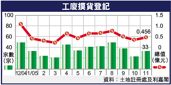 【本報訊】工廈市場因不乏低水物業,形成摸貨活躍,利嘉閣地產研究部主管周滿傑說,11月共有33宗工廈摸貨登記,較10月回增43.5%,總值4560萬元,增33.3%;預期工廈投資市道持續熾熱。