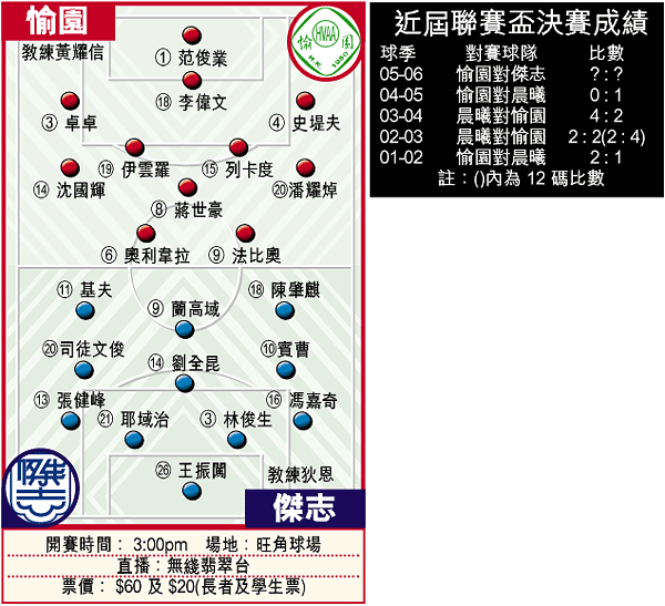 上屆「四亞王」愉園今午三時在旺角球場,與傑志爭奪今個球季首項錦標-聯賽盃冠軍;雖然傑志開季至今保持不敗,不過,愉園教練黃耀信及門將范俊業賽前指出,在一場過的淘汰賽,經驗往往才是決定性,這方面愉園是稍佔優。(無綫翡翠台今日3:00pm直播)