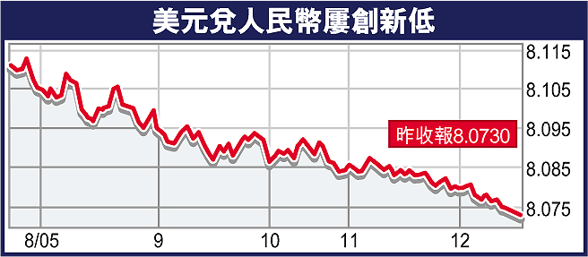 繼上周人民幣滙率四度創新高後,昨日繼續強勢,收市報每美元兌8.0730人民幣,但人民幣不交收遠期市場則表現淡靜。財資業人士表示,由於人民幣滙率持續有秩序攀升,加上接近年底,人民幣遠期合約的炒賣活動將收斂,料折讓價變化不大,但同時亦因人民幣現貨價保持緩慢升勢,年底前美元將繼續缺乏承接力。