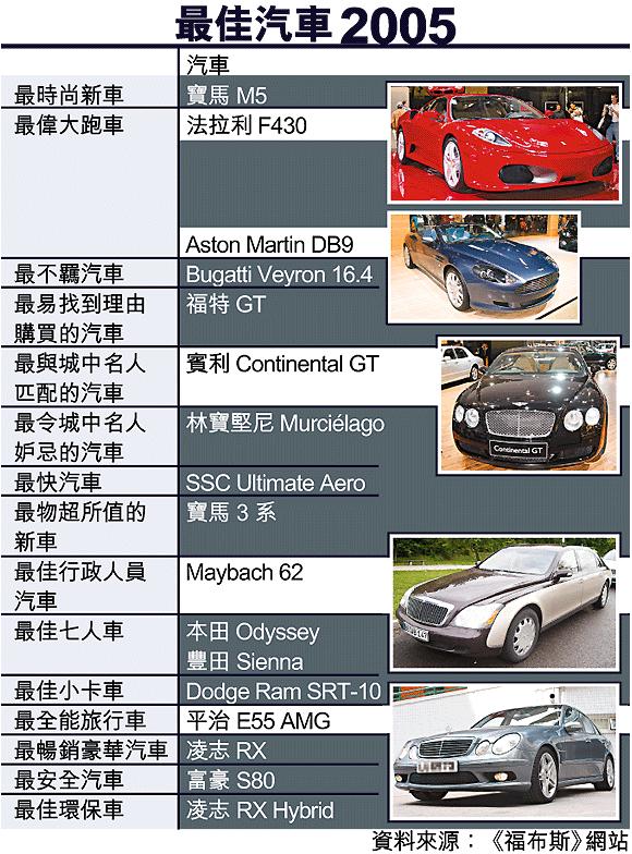 美國《福布斯》網站選出的今年最佳汽車,除包括極為昂貴的房車外,也不乏一般人可負擔的。若講求速度,非最快汽車SSCUltimateAero莫屬,其最高時速高達二百六十至二百七十三哩;但法拉利F430及AstonMartinDB9卻以出色的外形,成為最偉大跑車。