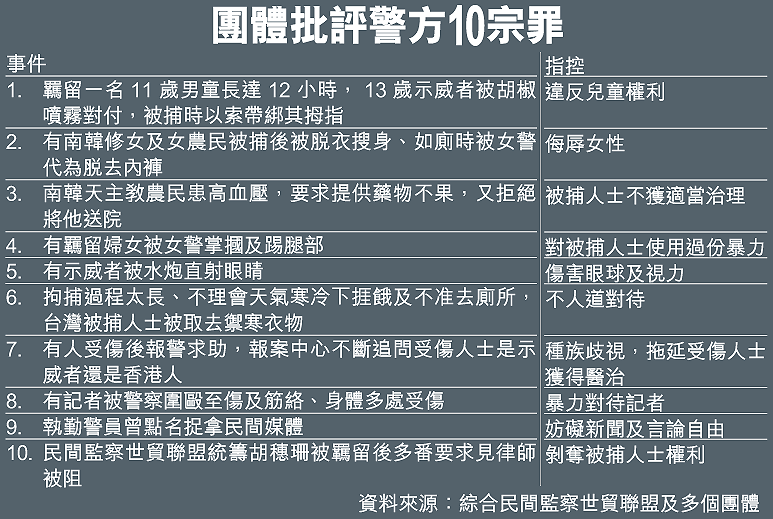 她又稱,部份南韓婦女恰逢經期,她們幾經要求警方才提供了三包衞生巾。由於地下冰涼,多名婦女曾拒絕坐在地上,卻被一名高級女警員大聲呼喝,有人更出手掌摑被羈留的婦女,還猛踢其腿部。南韓女示威者李胤周指一名男警員迫使她印指模時拳打腳踢,並把她推倒地上,手腳、頸及肩膊被打。