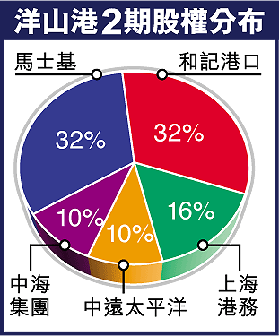 【本報訊】和記黃埔(013)宣布,落實入股上海洋山港2期碼頭項目32%。2期項目其他股東包括A.P.穆勒-馬士基,持股量同為32%;招商局國際(144)持股30%的上海國際港務集團,則佔股16%;中遠太平洋(1199)佔股10%;中海發展(1138)母公司中海集團同樣持有10%(見圖)。至於新加坡港務,則不在2期名單內。