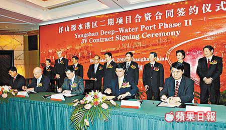 洋山港2期各合資夥伴,昨日於上海市新錦江飯店舉行簽約儀式。和黃主席李嘉誠出席簽約儀式後說:「集團是第一個於90年代初,在上海投資合作經營集裝箱碼頭業務的外資企業,今後將一如既往地配合上海市政府,為上海未來的發展作出更大的參與。」