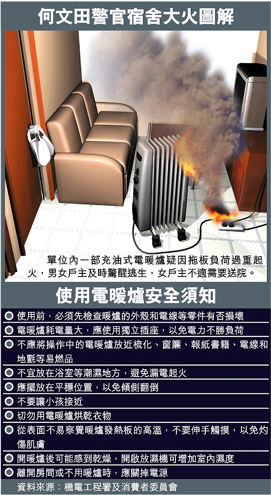 暖爐火警意外發生於昨凌晨三時許,據知姓陳男戶主之前於客廳啟動一部充油式電暖爐取暖,稍後男女戶主到睡房睡覺,其後兩人在睡夢中突然嗅到濃烈燒焦氣味,同遭濃煙嗆醒,先後走出房外查看,赫見客廳電暖爐拖板着火猛烈燃燒,火燄更波及暖爐旁邊梳化及雜物。