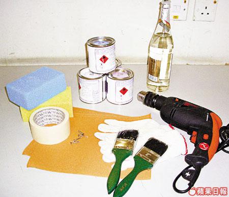 油漆、油漆掃、天拿水、電鑽、手套、粗幼砂紙、海綿、牛皮膠布1卷。