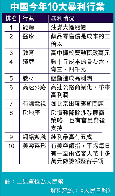 該報分析,油煤價漲,又發生油荒,北京居民用電,由每度四點四角(人民幣.下同)漲至四點八角,還有唐山或山西能源區的煤礦富豪冒起,更令能源行業居於暴利之首。醫療之所以在內地達致暴利,主要因為調查發現藥品零售價往往是生產成本的三倍之上;不過藥品企業利潤估計只得一成半,最大利潤是落入醫院的口袋裏。