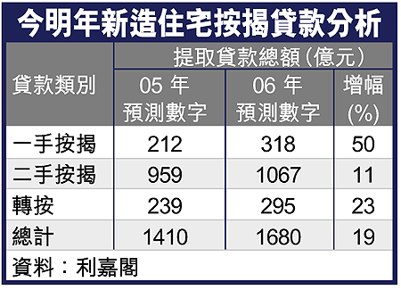 利嘉閣按揭代理業務經理黃詠欣預計,今年全年新造按揭貸款達8.72萬宗,總金額達1410億元(見表)。