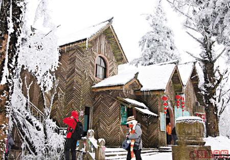 在上金頂的途中,車子停在半山的一個滑雪場,場外豎起了一個個金髮老外滑雪人形紙牌,很爆笑,於是,在沒有任何期望下踏入這個滑雪場,卻反而喜出望外。佔地15畝,滑雪場上還建造了一些很有歐洲風味的小屋,如果不是中國女子站在櫃台前,真的以為是身在歐洲。