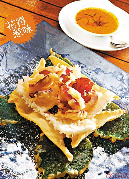 嫌送花無新意?不如帶女朋友嚟食花啦!將玫瑰花瓣、香葉、鍋粑等炸成天婦羅,食時蘸點混入花生的泰式酸辣醬,惹味玫瑰食落肚暖胃,好過買嚟齋睇。