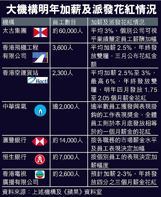 太古集團是本港聘請最多員工的企業之一,集團發言人昨稱,本月已通知旗下公司,可向員工加薪平均百分之三,個別公司可按營業額再作增減。其中集團旗下的香港飛機工程有限公司,日前去信通知全體三千多名員工,明年平均加薪百分之二點五。香港民用航空事業職工總會主席陳義有表示,據他了解個別員工加薪幅度達接近百分之四,工會接受公司的加薪方案。