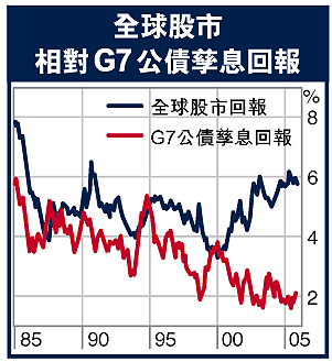 這是2005年的狀況。那麼2006年呢?其中一個值得留意的趨勢,是G7的工業生產和經通脹調整後貨幣供應增長之間的變化。一般情況下,當貨幣供應增長高於工業生產,新增資金便會投入金融資產;當差距收窄或消失,資金傾向撤離市場,對一些資產類別造成打擊。目前貨幣增長依然高於生產增長,但差距正在收窄,意味着市場在2006年或不能延續近幾個月的良好表現。