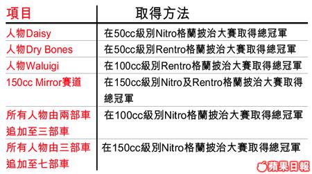 另外,遊戲內藏不少隱藏角色,你要在不同的比賽勝出後方可使用,究竟哪個最吸引?睇睇下表便可知得一清二楚。