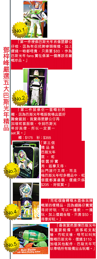 其實早前互聯網已廣泛流傳了鄧梓峰與巴斯光年被網友用電腦併合的合照電郵,兩人相似程度接近一百巴仙,十足餅印一樣,所以本報早前專誠邀鄧梓峰到香港迪士尼樂園,探訪他這位在迪士尼生活的孖生兄弟。