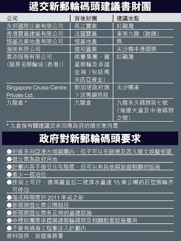 新郵輪碼頭雖不是地產項目,但仍吸引大地產商,除因項目可包括配套設施如酒店、餐廳及零售等設施外,財團提出的碼頭選址均鄰近或位於其本身的投資物業內。如建議在紅磡灣興建新碼頭的永邦國際,據公司註冊處資料顯示,其董事包括長實副主席李澤鉅,故相信長實是以永邦名義遞交建議書,該集團於紅磡擁有酒店、寫字樓及零售店舖。信和置業項目經理陳偉豪亦向本報證實,信置以海策名義遞交建議,於中港碼頭加建郵輪碼頭設施,該碼頭位於集團物業中港城內。恒基地產亦有遞交建議書,但並沒有提出建議地點。
