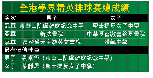 【本報訊】聖士提反女子中學昨晨在首次採取五局三勝賽制的「全港學界精英排球賽」決賽,直落三局擊敗銘基書院兼成功衞冕女子組冠軍;男子組方面,「黑馬」盧幹庭紀念中學,則以三比一挫新法書院,首奪冠軍。