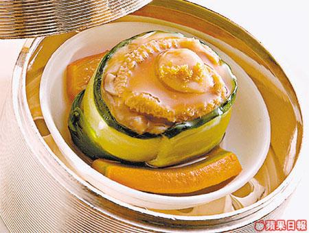 以花菇、蝦及瘦肉做餡,底下墊有南瓜吸收精華,再以青瓜包裹鮑魚。半個拳頭咁大,一個差不多飽。