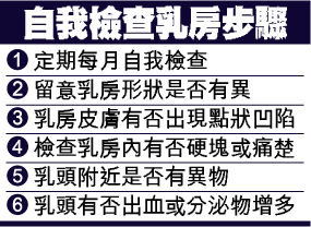 整形外科醫生金醫生表示,若乳房內的瘤屬惡性,在不知情的情況下進行豐胸療程期間透過儀器、人手按摩或氣壓,對胸部施予壓力,可能會令腫瘤加速生長及擴散。他建議每名婦女應每月自我檢查乳房(見表),特別是考慮接受豐胸或纖體療程前,應向醫生諮詢專業意見。