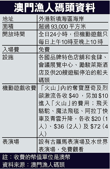 漁人碼頭佔地九萬平方米,七十二個餐飲、零售租戶將相繼投入營運,免費入場,但機動遊戲則於每日早上十時至晚上十時運作,收費數十元。昨晚七時半樂園正式開放予公眾入場,數以千計遊客一湧而入,有澳門居民鼓躁,與保安員發生爭執,不滿排隊安排不善,太過擠迫。各個場地於不同時段備有五十場五彩繽紛的節目,遊客更可在水世界表演場免費觀賞到精采節目預演。