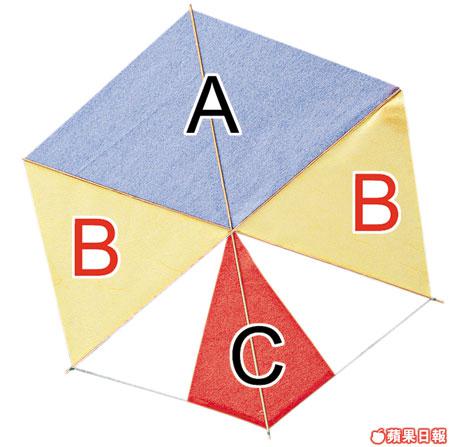 用繩將3條竹條的末端綁緊(如黃虛線),把高10吋、闊6吋的菱形紙貼在C位置上。