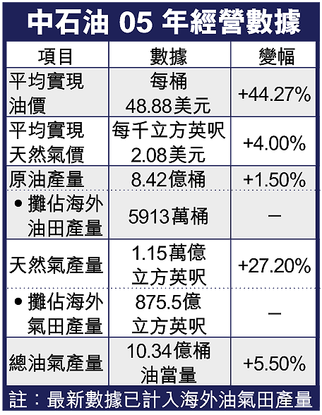 中石油(857)昨晨公布05年全年經營數據,由於計入與母公司合資經營的海外油氣田產量,令其全年油氣產量均「超額完成」,總油氣產量10.34億桶油當量,較04年增長5.5%。全年平均實現油價為每桶48.88美元,大升44.27%。