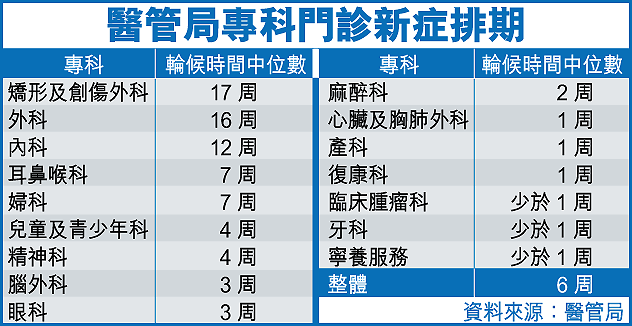 【本報訊】醫院管理局指出,於去年四至九月專科門診輪候時間的中位數約為六星期,而其中矯形及創傷外科輪候時間最長,平均需要輪候十七星期;其次是外科,為十六星期。