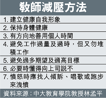 該講座由教統局等主辦,吸引了約二百名教師出席。主講嘉賓林孟平說,許多教師受快速的教改步伐及工作壓力影響,而患上情緒病「心因症」,並出現全身疼痛、呼吸困難、失聲、惡心等症狀;其中更有一名女教師曾因工作壓力導致便秘,遍尋名醫也無法解決,後來該教師於一年多後自殺身亡。