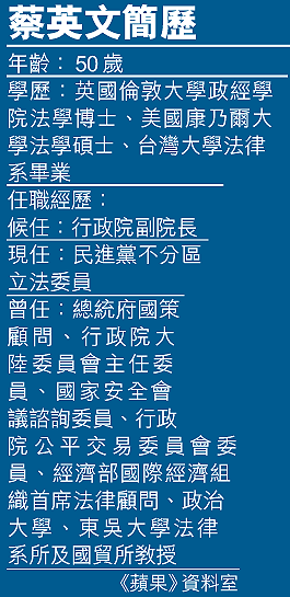 台灣昨天公布行政院新內閣人選,由陸委會前主委、現任民進黨不分區立委蔡英文出任副行政院長,主掌兩岸經貿事務。美、台兩地學者認為蔡英文將積極配合陳水扁兩岸政策,能否改善兩岸關係則持保留態度。