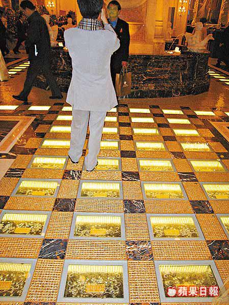 【本報訊】投資二十億港元,採用英國宮廷式設計的澳門英皇娛樂酒店,昨日正式落成啟用。酒店大堂中央用七十八塊千足純金,鋪設成「黃金大道」,任由客人觀賞踏足。其中一個貴賓廳每鋪的注碼,最高達二百二十萬元。