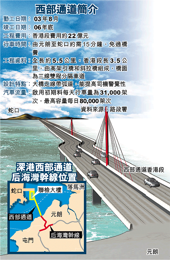 深港西部通道是兩地政府合作的最大型基建,也是全國最寬闊的大橋,連接元朗鰲磡石和蛇口東角頭橫跨后海灣,由兩座索塔支撐橋面,雙程三線共六條行車道,全長五點五公里,香港段長約三點五公里,耗資二十二億元。大橋設計壽命為一百二十年,每年保養費用約一千多萬元,通車後相信能紓緩落馬洲、沙頭角及文錦渡三個陸路口岸的交通。