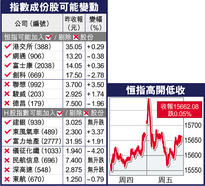 恒指收報15662點,微跌8點或0.05%,全日高低波幅223點;H指收報6097.34,微跌6點。交投持續暢旺,達335.27億元。大市基本由期貨主導,即月期指收報15651,轉低水11點,但2月期指則高水33點,收報15695,兩個月成交合約共5.17萬張。